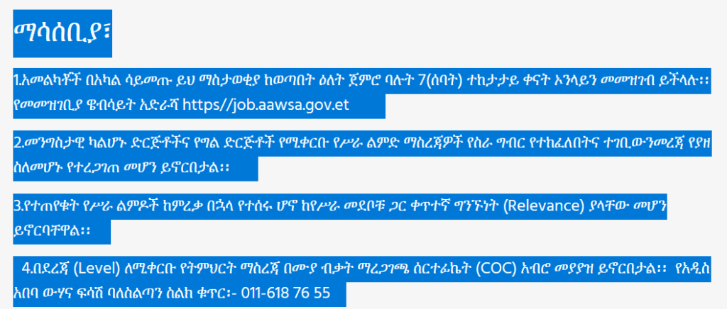👉 Registration Website: https://job.aawsa.gov.et - Work experience certificates submitted from private or non-governmental organizations must be authenticated. They must clearly show that employment tax has been paid and contain the required supporting information.