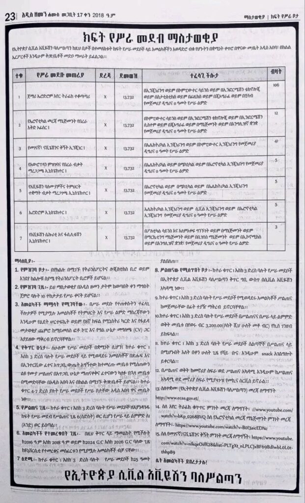 Ethiopian Civil Aviation Authority Vacancy, (ECAA) is the national regulatory body responsible for overseeing and managing civil aviation activities in Ethiopia. Established to ensure the safety, security, and efficiency of air transport services, the authority regulates airlines, airports, air navigation services, aircraft operations, and aviation personnel licensing.