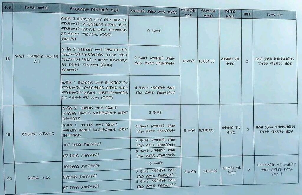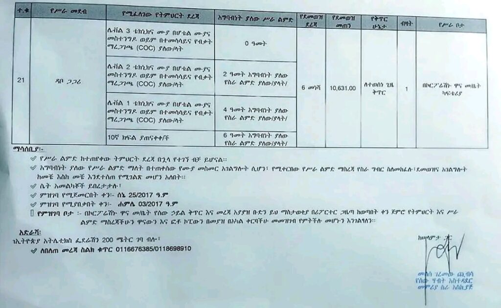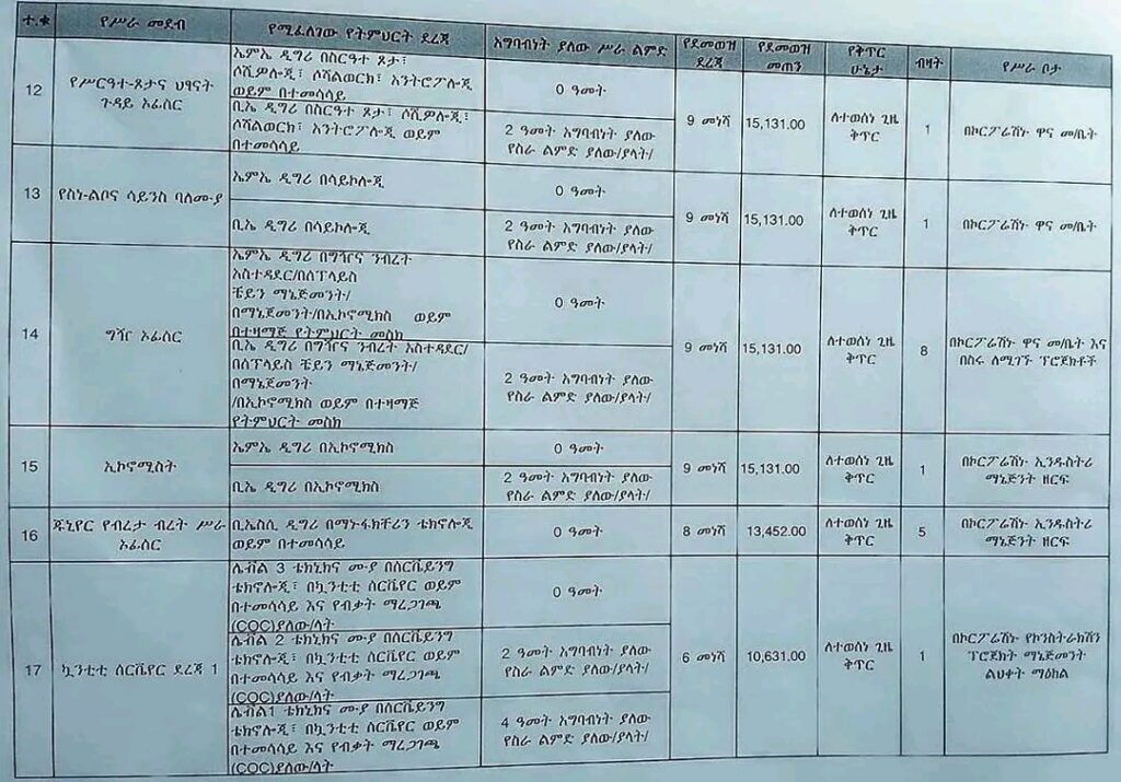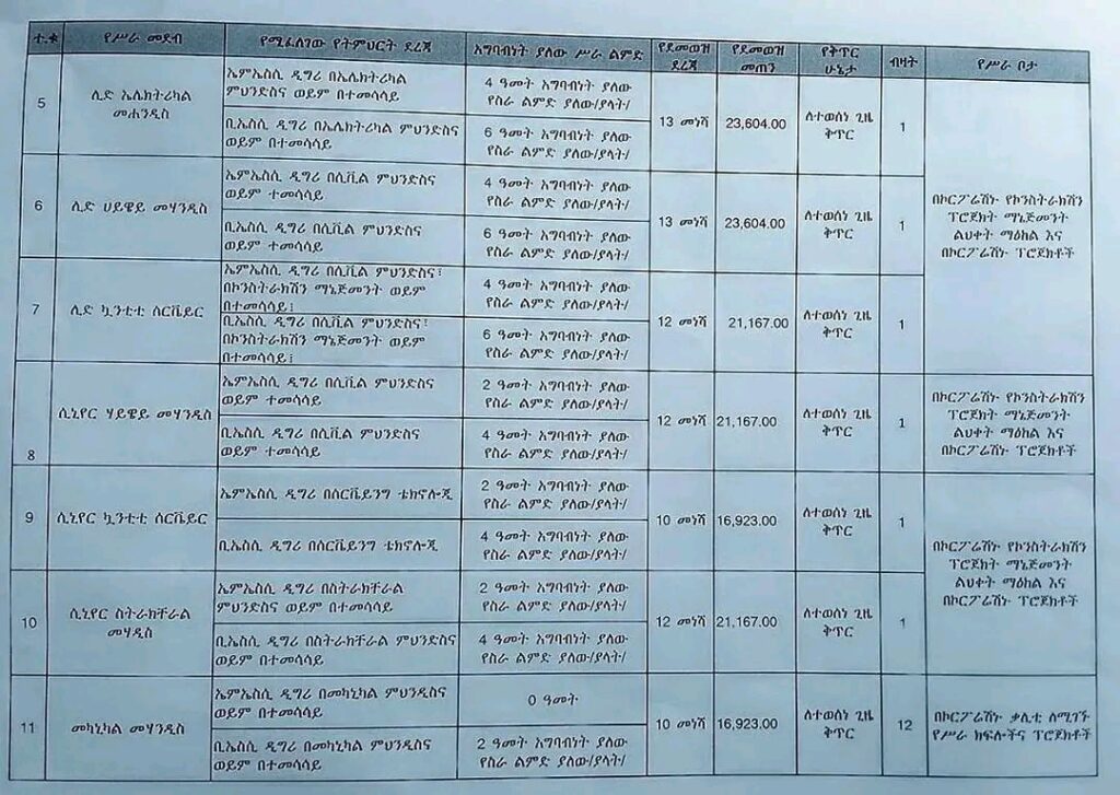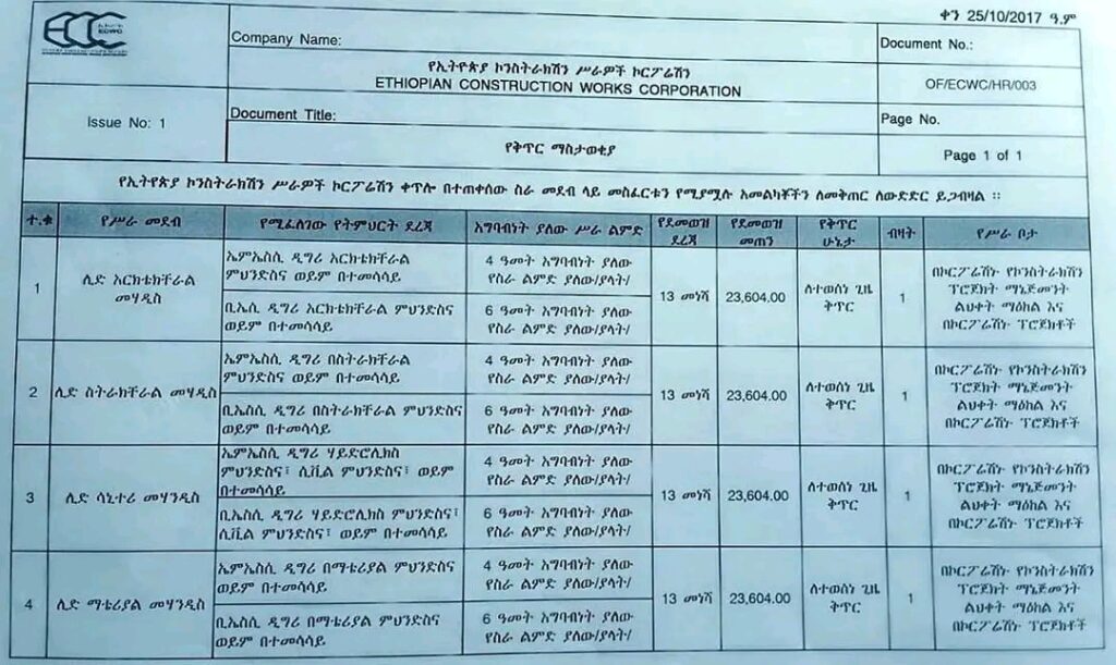The Ethiopian Construction Works Corporation is inviting applications for the recruitment of 2014 E.C and 2015 E.C graduates who meet the requirements for the following positions: Therefore, applicants must have a Higher Education Certificate with a CGPA of 3.5 or above for males and 3.25 or above for females.