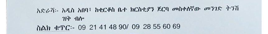 Address: Kirkos Church, behind Meskelengna Road, slightly down from Felege Yordanos School, 5th Floor of the building in front.